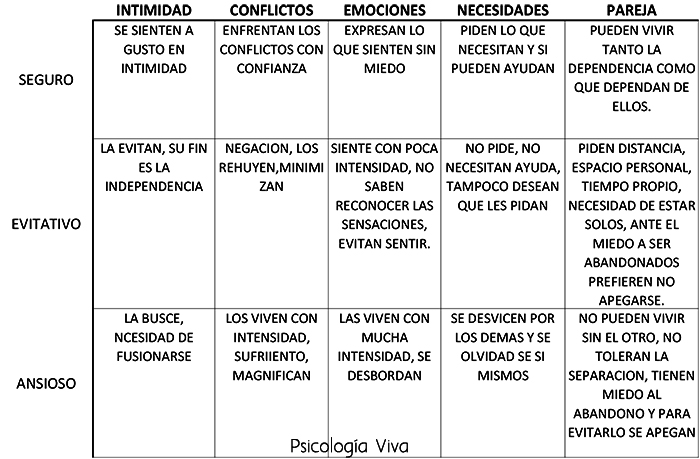 Seguro: Me resulta relativamente fácil intimar emocionalmente con los demás. Estoy cómodo dependiendo de otros y cuando los demás dependen de mí. No me preocupa estar solo o que los demás no me acepten. Tengo confianza, soy comprometido. las personas seguras se sienten a gusto en situaciones de intimidad y suelen ser cálidas y cariñosas.